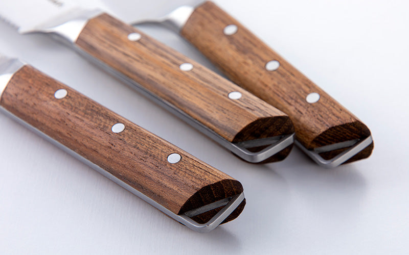 The handle is a "hon-tsuri" style, with the blade's stem sandwiched between two boards on either side and secured with three rivets. The hon-tsuri is sturdy, so the force applied to the handle is easily transmitted to the blade, allowing you to slice meat and fish with little force. You can use it for everyday cooking without stress.