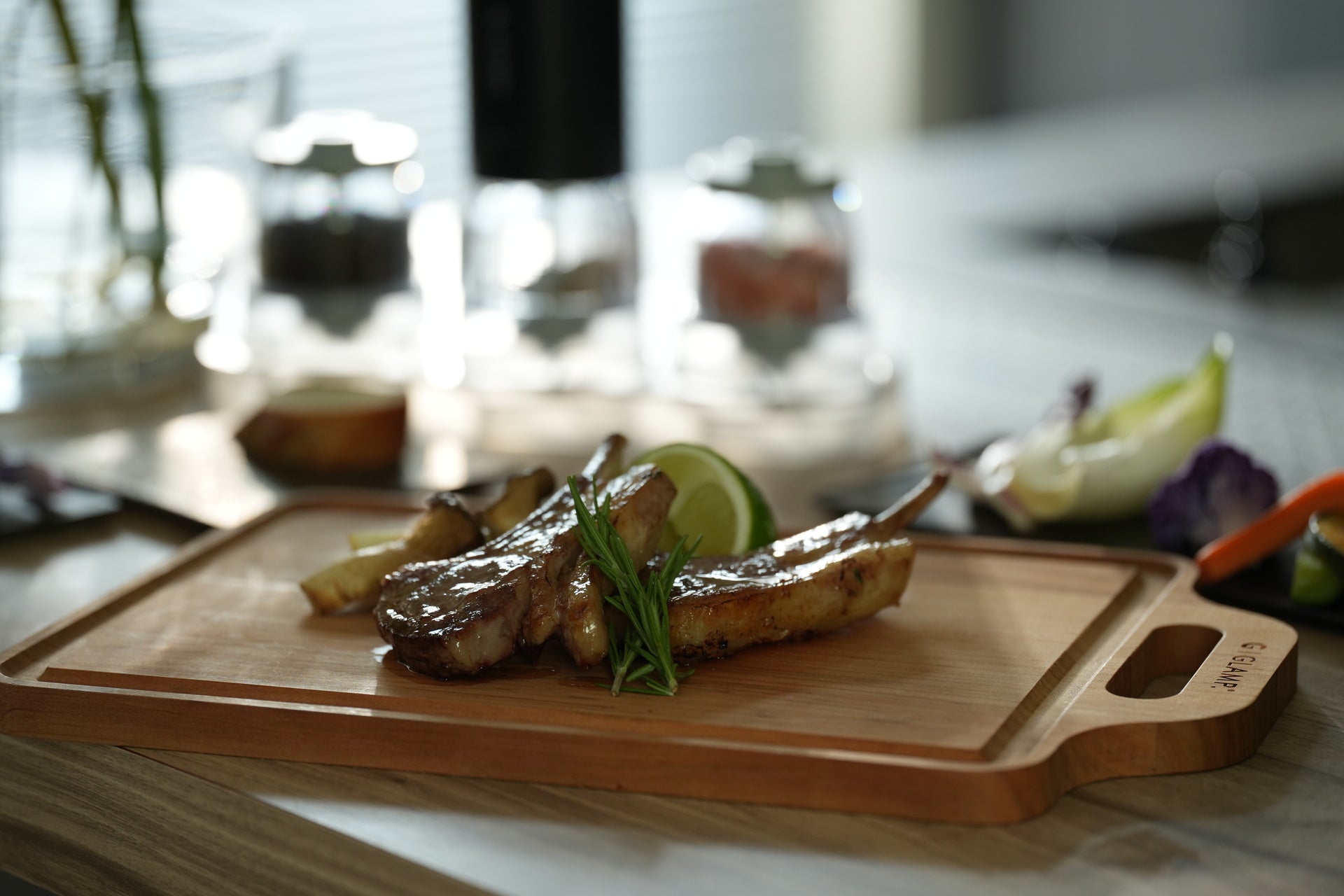 高知県産の桜の木を使用した上質なカッティングボード。握りやすいハンドル付きで、キッチンからテーブルへの持ち運びが簡単です。四隅の段差設計により、肉や魚の調理時の汁や水分をしっかりキャッチ。まな板としてはもちろん、そのままサーヴィングプレートとしてもお使いいただけます。